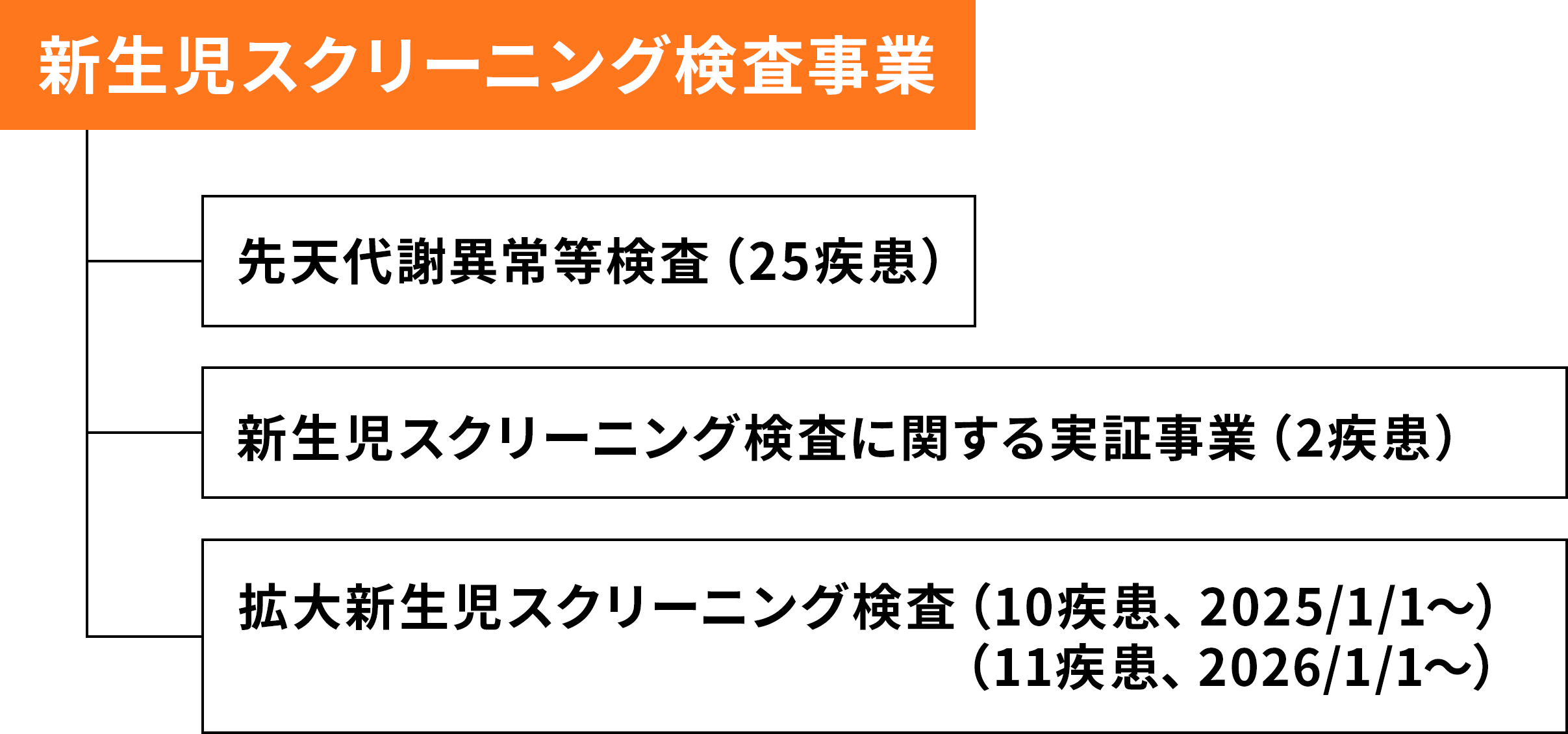 現在、長野県立こども病院では、長野県から委託された新生児スクリーニング検査事業として、先天性代謝異常等検査25疾患と令和6年10月から公費化に向けた国の実証事業となった2疾患(原発性免疫不全症及び脊髄性筋萎縮症)を対象とした検査を実施しています。